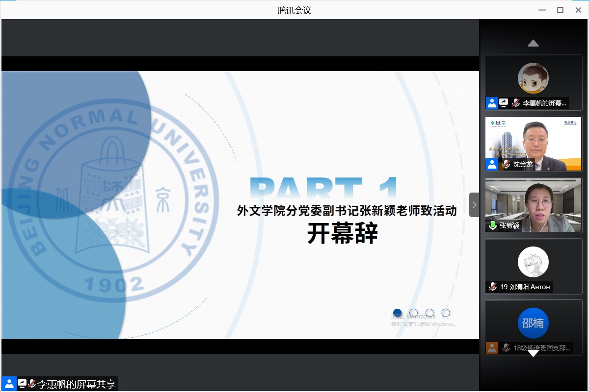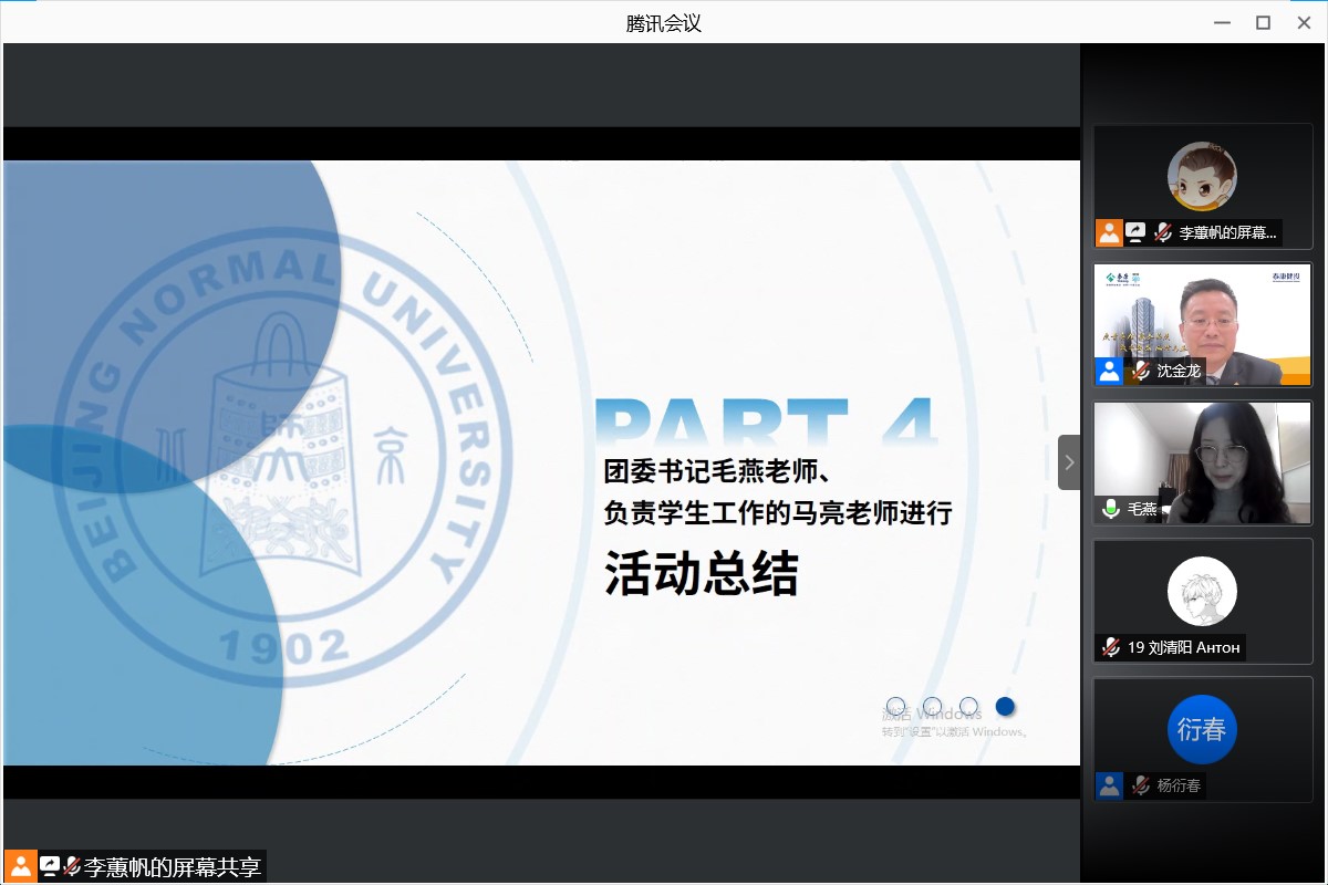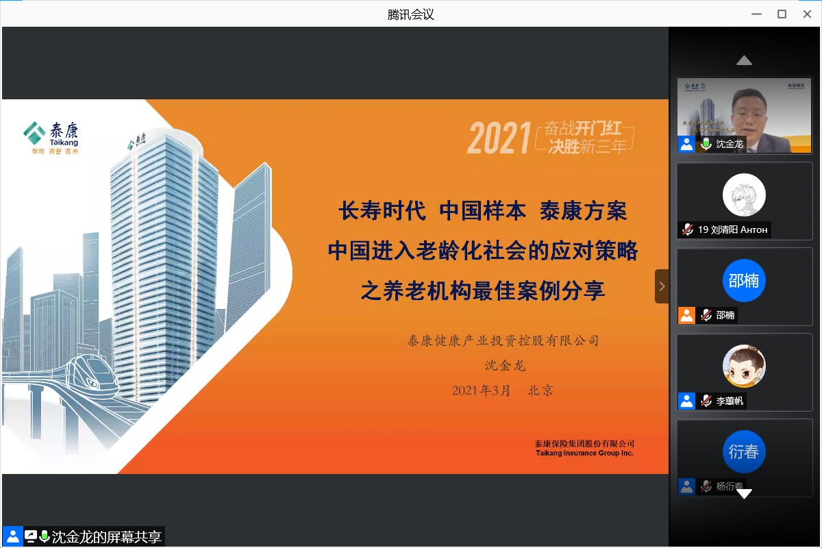 2021年3月3日19:00时《泰康之家通讯》总编、泰康之家电视台(筹)台长,北师大校友沈金龙先生与外文学院俄文系教工党支部、博士生党支部、俄文系17级、18级、19级、20级团支部进行了“长寿时代泰康方案中国样本—中国进入老龄化社会的应对策略之养老机构最佳案例分享”的线上主题分享。本次共建活动的宗旨就是贯彻习近平总书记提出的尊老、敬老、助老、爱老思想,践行教育部2020年印发的《高等学校课程思政建设指导纲要》中提到的立德树人的精神。