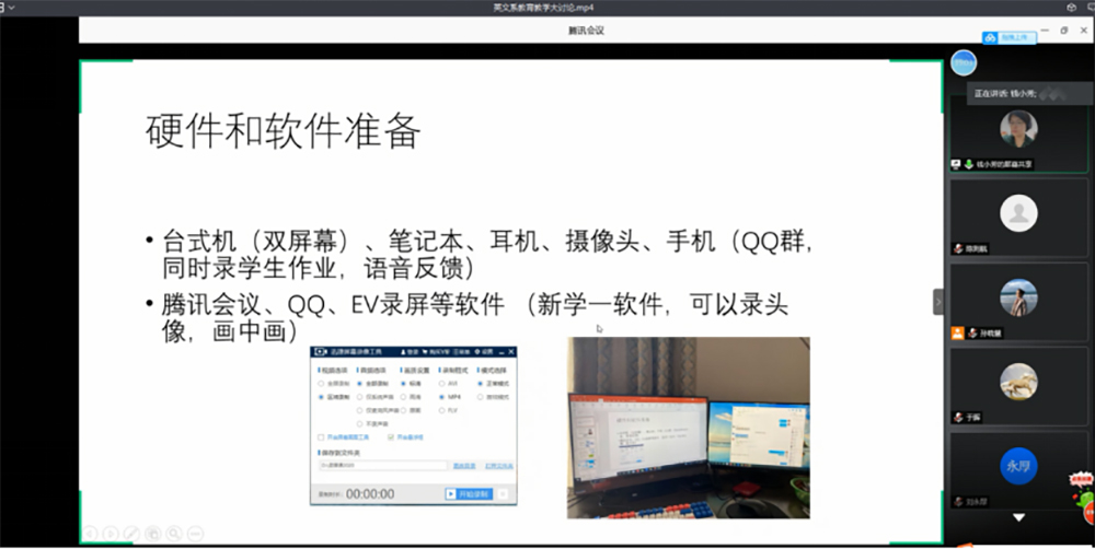 就本学期线上教学而言,教师们纷纷表示授课顺利,与学生互动也很多。多名教师分享了自己远程授课的做法和经验,从教学平台到录屏软件,从教学方式到教学评价,教师们努力学习和挖掘互联网优势,提升教学效果。针对不同类型的课程,教师采用直播/录播、直播+录屏、课堂讨论(辩论)、小组展示、QQ群定时答疑、以任务推动教学等方式开展教学。而在评价和课堂互动方面,教师也充分发挥互联网优势,采用学生实时拍照分享课堂练习或作业、问卷星即时问答、录音练习口语、个别辅导、作业匿名互评等方式开展,极大的促进了学生的学习积极性。在提高学生自主学习意识方面,教师通过提前布置课堂讨论任务,开展线上科研讲座和线下读书活动,提高学生科研能力、读书意识,主动学习意识。