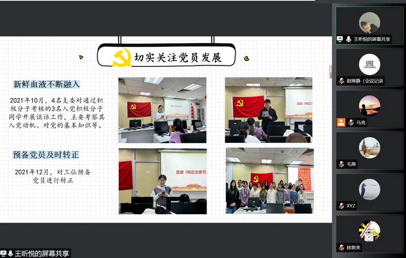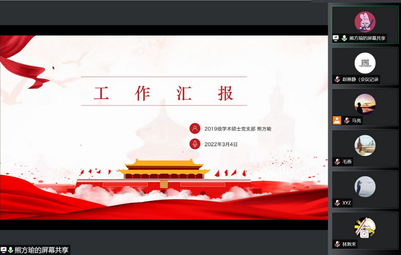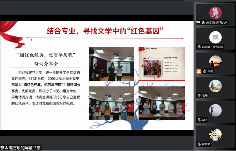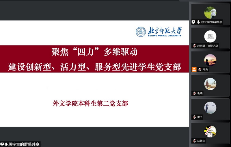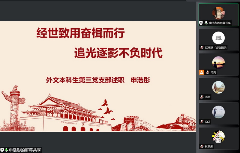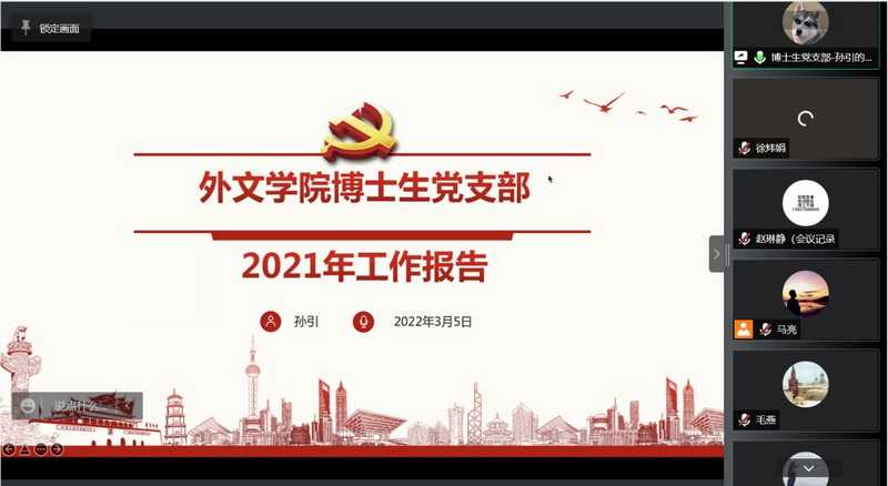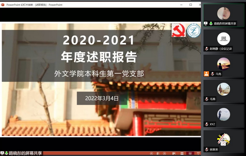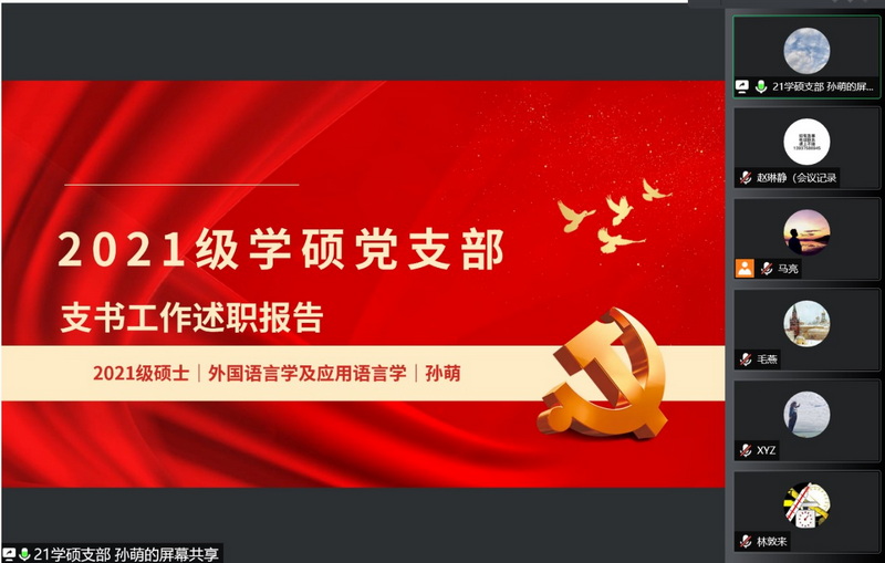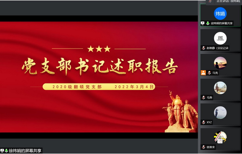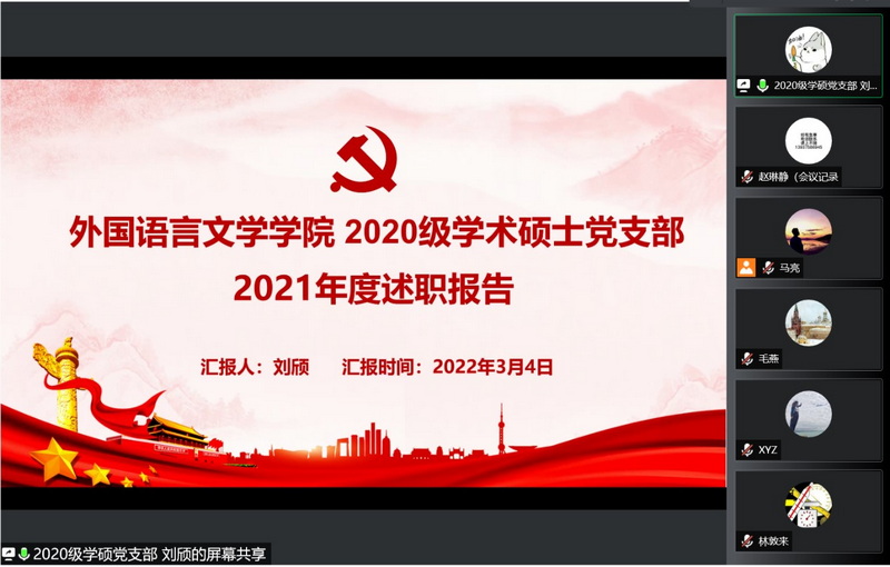 2022年3月4日下午,外文学院党委于线上举办2021年度自慰直播 学生党支部书记述职考评会。会议由外文学院党委副书记张新颖老师主持,学院党委书记艾忻老师、党委组织委员林敦来老师、团委书记毛燕老师、双肩挑辅导员马亮老师,以及9名学生党支部书记参加了本次会议。