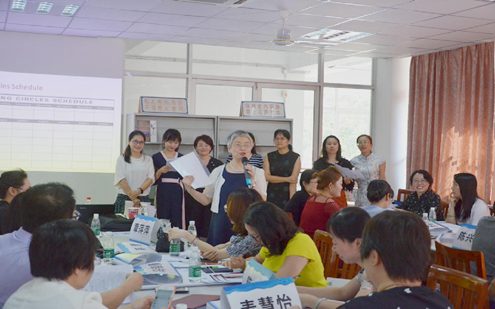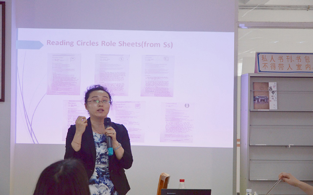 20日下午,外教所专家团队在海南中学开展了工作坊活动,来自海南中学和海南中学三亚学校的初高中全体英语教师参加了本次活动。首先是罗老师及孙老师以“阅读圈”为主题开展第一个活动。罗老师介绍了北师大开设的英语阅读课的经验,她提出阅读不仅是一种语言使用技能,更是重要的社会文化活动。通过对“阅读圈”具体实施办法与细节的阐述,辅以图像示例,参加工作坊的老师们对“阅读圈”与“多元阅读”等专业术语有了更深的了解。