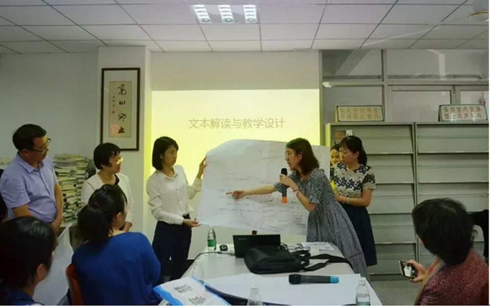 工作坊第二部分是王老师、陈老师、钱老师组织的“文本解读与教学设计”活动。王老师首先带领老师们回忆有关核心素养理念的关键内容,并采用小组合作的形式,邀请老师们对两篇阅读材料运用思维导图的形式进行解读并分享。现场气氛非常热烈,大家都踊跃地参与了讨论。