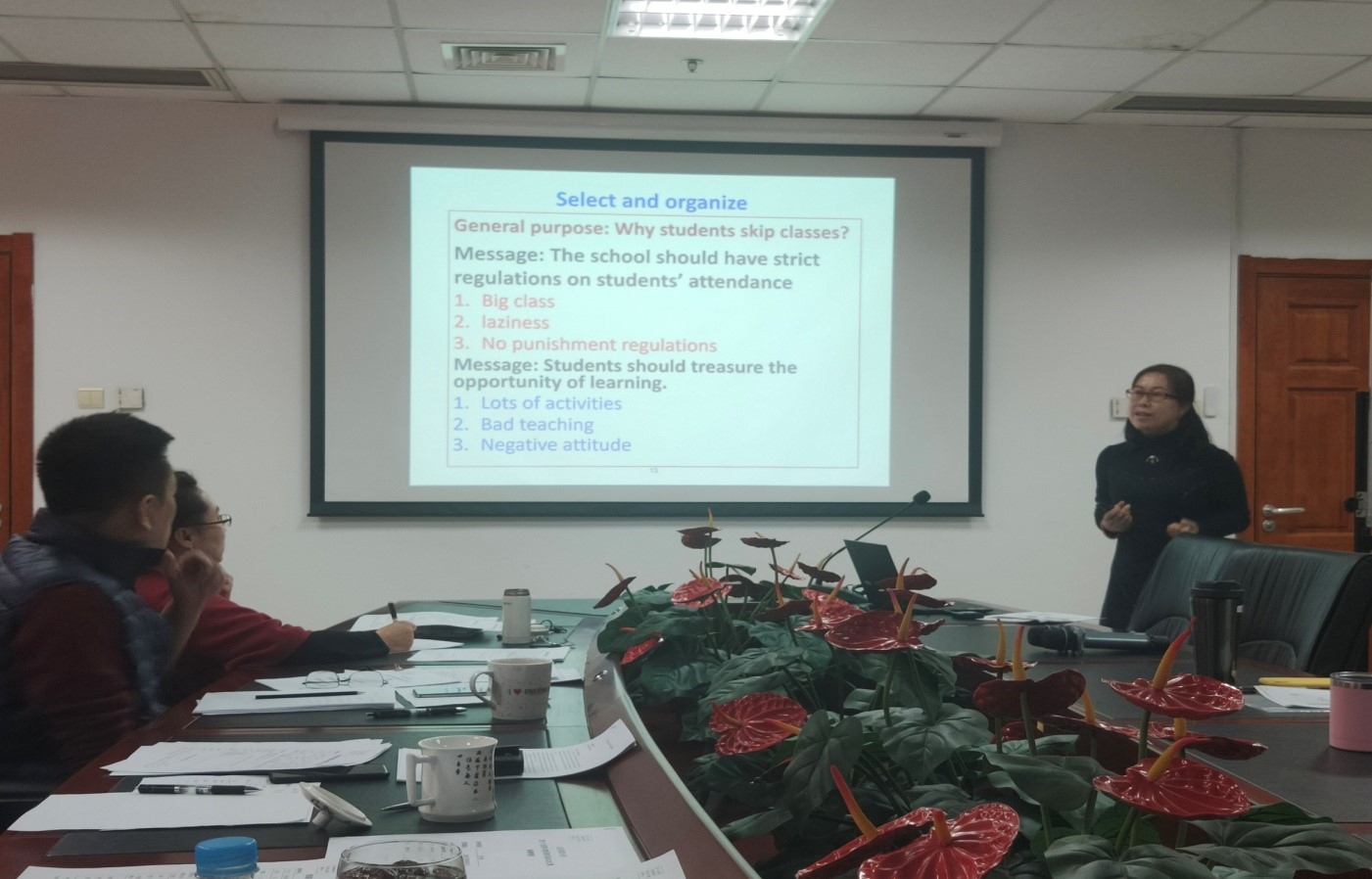 最后,分党委书记刘娟老师做总结。刘书记回顾了外文青教赛的传承精神以及曾取得过北京市二等奖和校级比赛多个一等奖的历史成绩,并指出青教赛以赛促进,助力青年教师成长的意义。作为评委,刘书记认为本届参赛青年教师的语言基本功非常好,教态大方自然、循循善诱,充分展示了外文学院教师专业知识扎实和富有亲和力的外语教师素质,祝愿选手们在决赛中取得好成绩。赛后,经评委会讨论,邵名莉老师获最佳风采奖、姚成贺老师获最佳板书设计奖、黄荷老师获最佳语言奖、徐畅老师获最佳教态奖。外文工会还将择日再次组织决赛前的磨课和教学演练。
