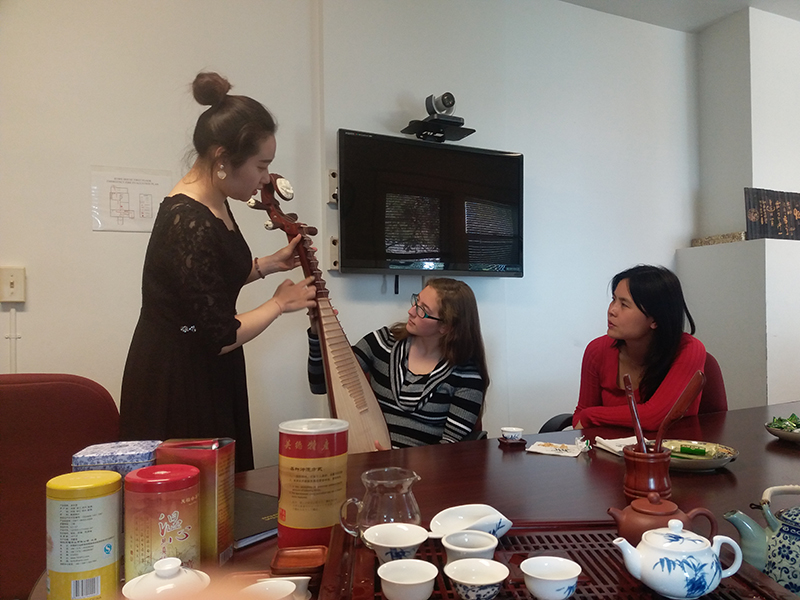 与此同时,志愿者教师赵莉向体验者们进行了中国茶艺展示。红木杯盏,茶香四溢,泡茶、喝茶、品茶、话茶。体验者一边品尝不同茶叶的色泽和味道,一边聊聊他们对于中文、书画、琵琶的感受,别有一番趣味。