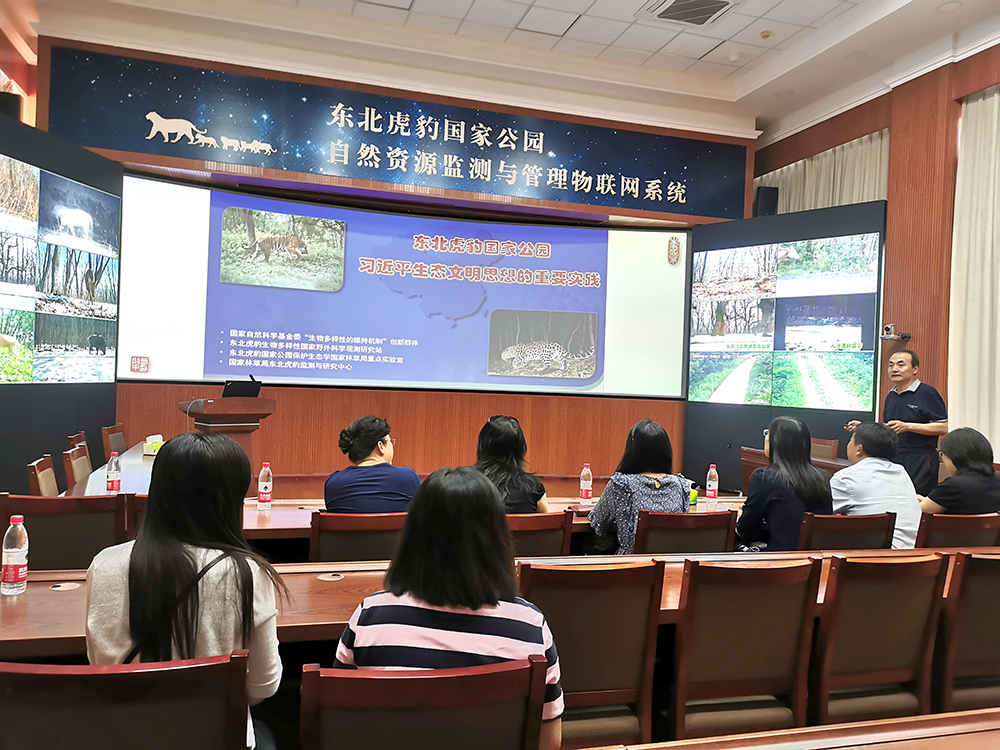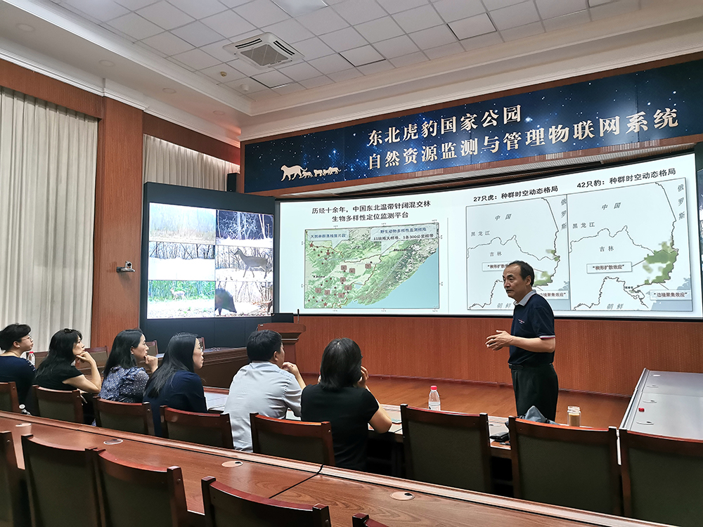 研究中心葛剑平教授为老师们详细介绍了东北虎豹国家公园自然资源监测与管理物联网系统。从生态物种保护的重要性到东北虎豹国家公园体制改革试点的成功、再到科研团队工作生活的酸甜苦辣,葛剑平教授用幽默风趣的方式向老师们娓娓道来。