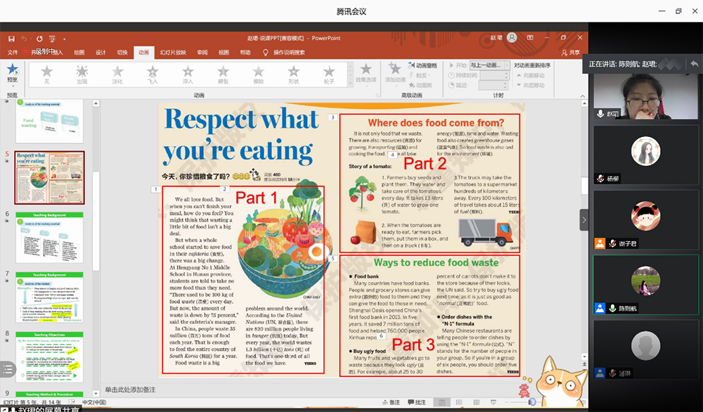 陈经纶中学的赵珺老师设计了一堂报刊阅读课,主题为食品粮食浪费。本堂阅读课参考任务型教学法的设计思路,目的是让学生真正做到“learning by doing”,并在学习过程中树立节约食物的意识,培养学生的社会责任感。专家团队对赵老师的设计给予了肯定,也建议老师明确和完善教学目标,并能在教学中适当放手,多让学生在阅读后自行对文章进行梳理。