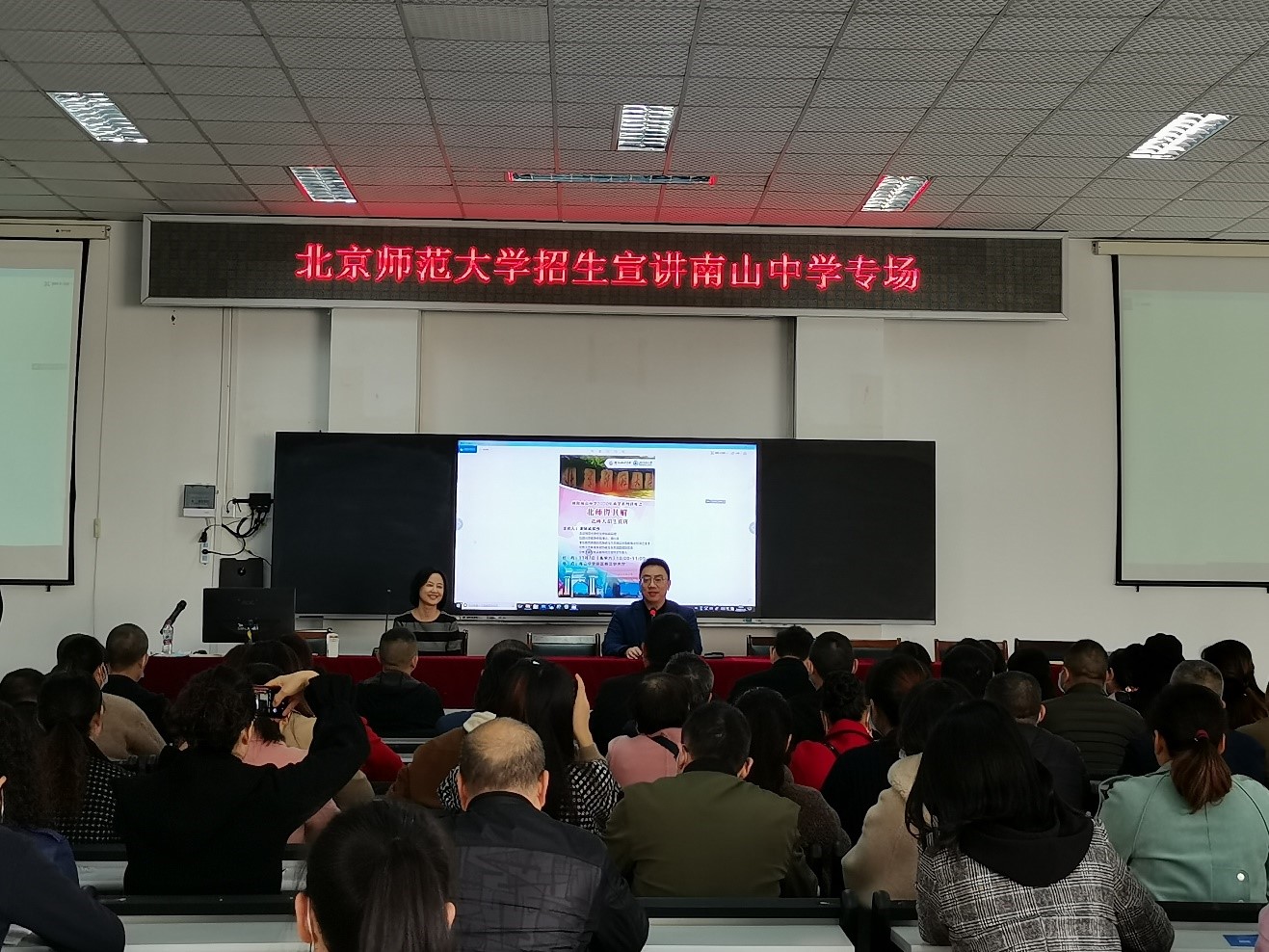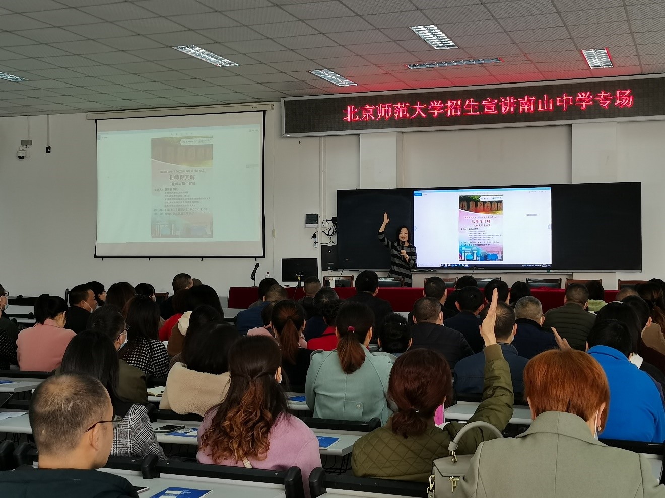 2020年1月,北师大在绵阳南山中学新建优质生源校。2020年11月7日上午,受学院委托,自慰直播 潘琳老师和刘冉老师前往绵阳南山中学进行优质生源基地回访和面向新一轮高三家长进行招生宣讲。绵阳南山中学约有100位家长参加了宣讲会。宣讲会结束,家长围绕潘琳老师问出许多自家孩子成绩、喜欢的专业等详细情况。潘琳老师根据学校招生情况,一一进行了解答。