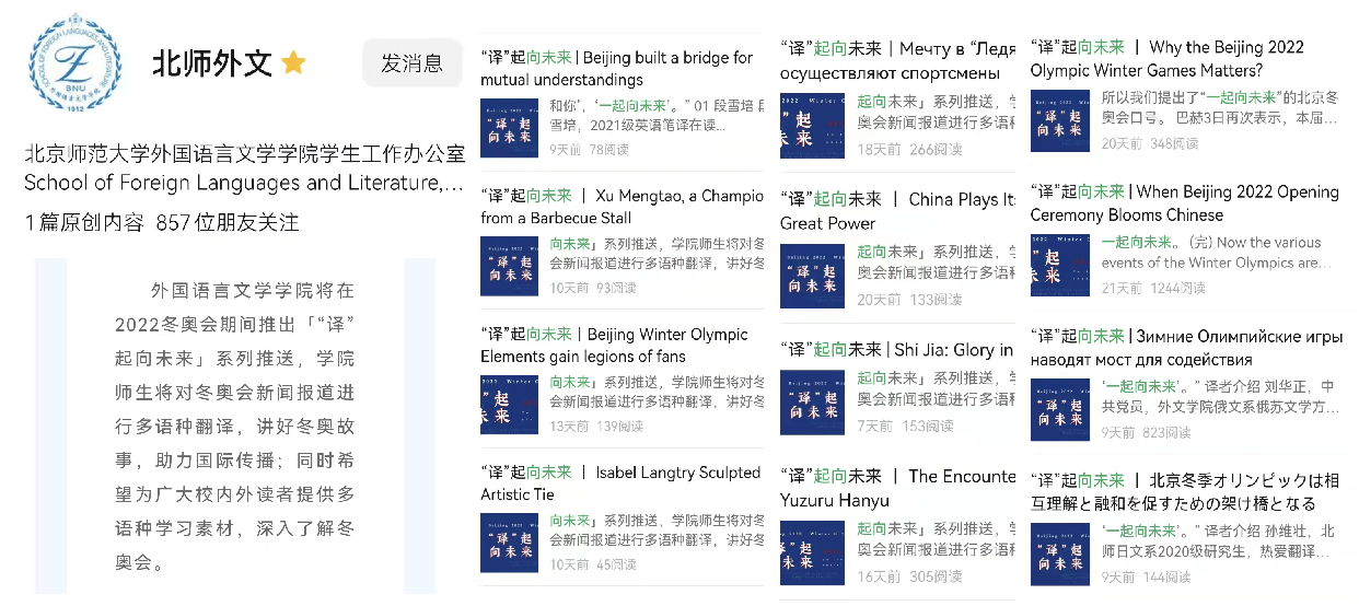 为加大冬奥会多渠道、多角度宣传力度,全面展示我校师生翻译成果,服务社会对于多语种冬奥会报道的需求,学院微信公众号推出《“译”起向未来》专栏,发布我校师生翻译完成的外文多语种系列冬奥会推送,讲好冬奥故事,为校内外广大读者提供多语种看冬奥、学冬奥素材。截至目前共发布专题推送36篇。中国日报社《21世纪英语教育》对学院师生开展的工作进行了采访和报道。
