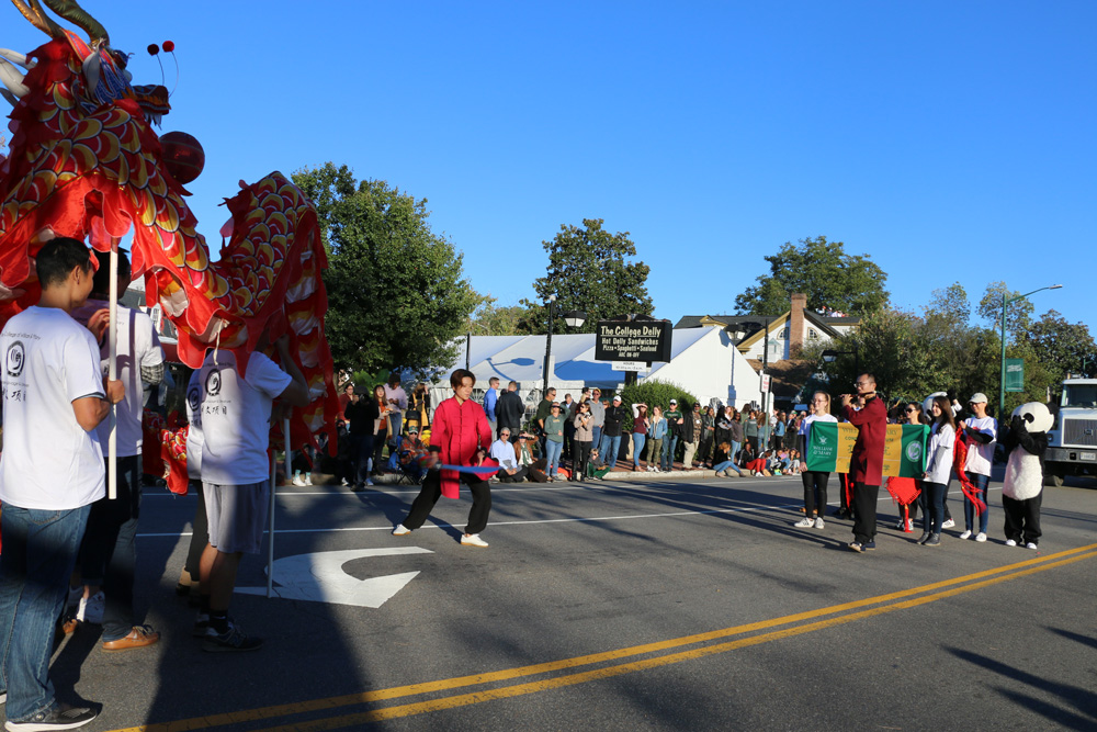 本次游行活动中孔院的舞龙队无疑是所有队伍中最出彩的一支,两只活泼的大熊猫在游行过程中积极和观众互动。道路两旁的观众里时不时会有孩子大喊:“Panda!”,此时两只憨态可掬的大熊猫便会转向孩子们热情地招手,途中还有很多观众前来合影。这两只熊猫无疑是孔院游行队中的“明星人物”。在游行终点进行的中国传统八卦单刀武术表演和竹笛演奏获得了观众的喝彩,为本次游行锦上添花。最终孔院在所有队伍中脱颖而出,获得了第二名的佳绩,为本次活动画上了圆满的句号。