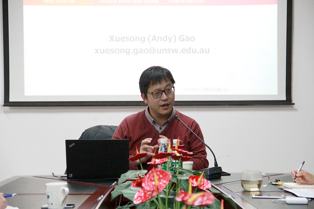 2018年12月24日15:30,澳大利亚新南威尔士大学教育学院高雪松副教授应于晖教授邀请,于后主楼1020室举行了“治学·修身”系列第八场、总第十六场讲座,主题为“Problematizing language teachers’ research engagement for professional development". 于晖教授主持讲座,罗少茜教授、钱小芳副教授、孙晓慧副教授、夏晓燕副教授出席本次讲座。