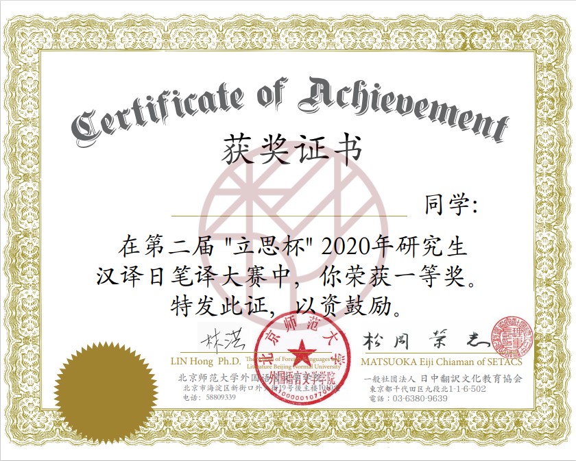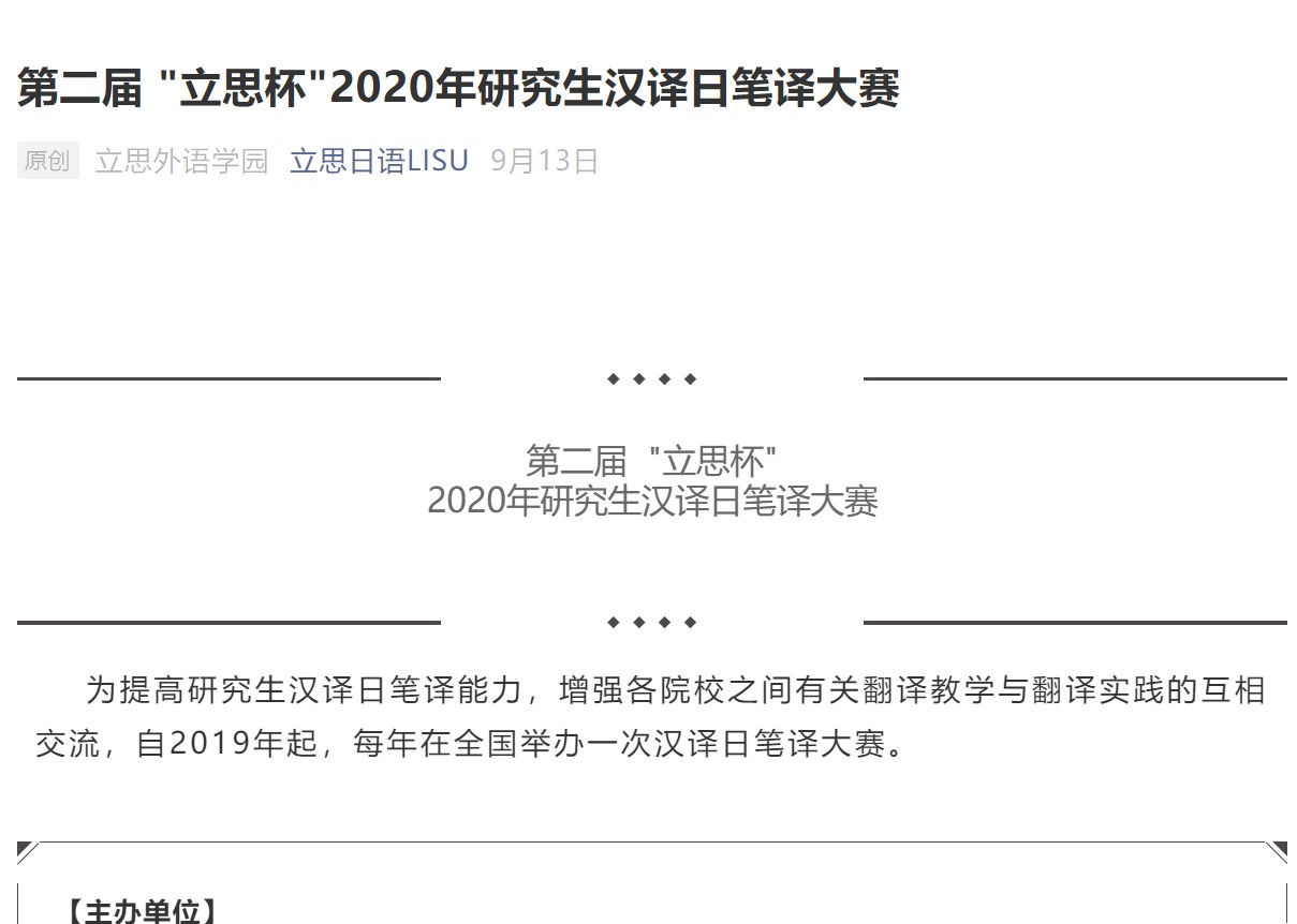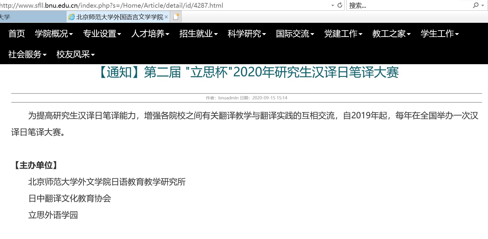 历经4个多月的筹备,由北京师范大学外文学院日语教育教学研究所(微信公众号:BNURYJX)、日中翻译文化教育协会(//setacs.org/)、立思外语学园(微信公众号:LISU_JPedu)主办的第二届“立思杯”研究生汉译日笔译大赛(全国)于2020年11月14日落下帷幕。