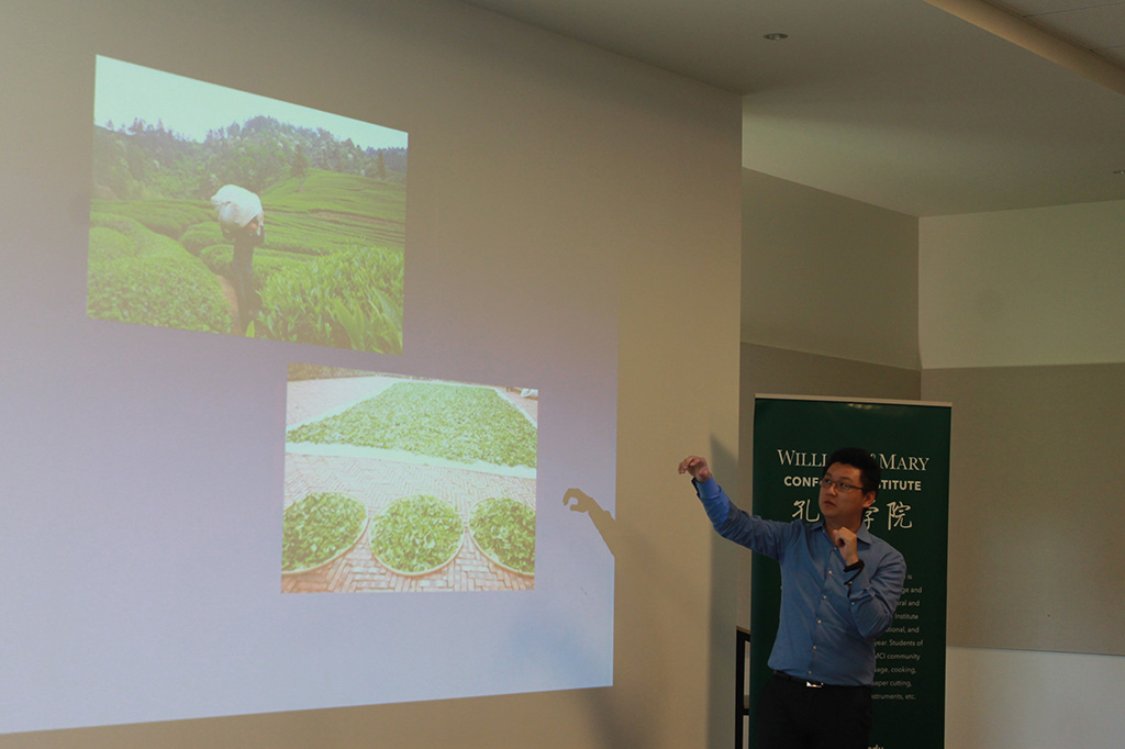 随后,张先生重点讲解了制茶流程。制茶流程主要分为采摘、萎凋、炒青、团揉和干燥几大步骤,其中团揉是指制茶师用手将茶叶来回搓压,并不时将茶叶摊开打散散热,再团圆挤压,使之成为更加紧实的球状茶团。这一步骤最见功力,也最独具韵味。张先生通过视频向大家展示了中国几位著名茶师的团揉手艺,并谈到,由于机器大生产模式的推广,目前仍使用传统手工艺制茶的制茶师已经很少了。机器虽然高效便捷,做出来的茶却总少了些味道。手工制茶工艺永远是中国文化中不可磨灭的一部分,是中国人内心深处一段氤氲着清香的记忆。