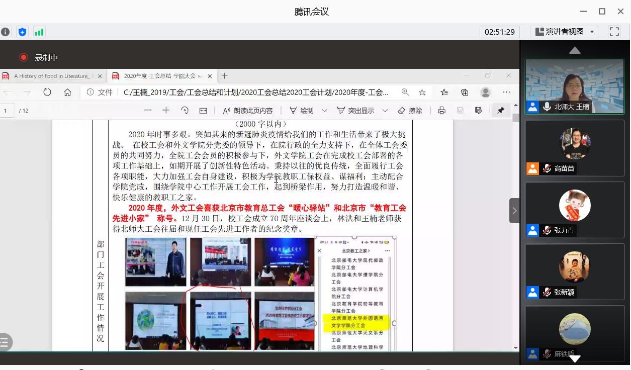 工会主席王楠介绍了2020年学院工会举办的各项活动及学院工会获得的各类奖项,同时也跟老师们分享了学院教师的爱心事迹。