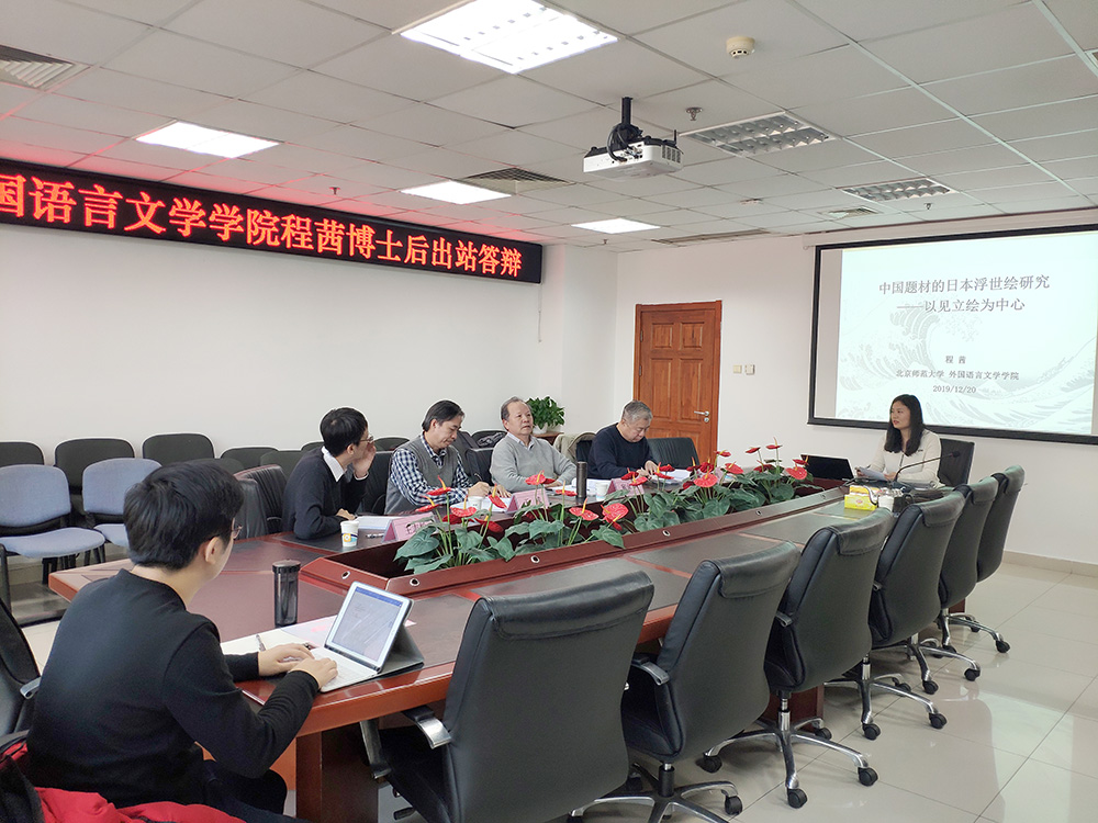 答辩主要由两个部分组成。首先程茜简要介了博士后在站两年来的研究工作,报告题目为《中国题材的日本浮世绘研究——以见立绘为中心》,主要对中国题材如何被日本浮世绘吸收的问题进行了深入的探讨。接下来四位答辩委员分别对程茜的研究工作做了点评和提问。四位委员充分肯定了该研究的创新性和研究意义,并针对下一步的工作提出了极具建设性的建议。