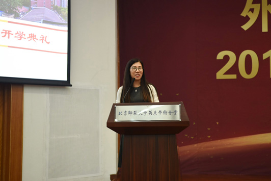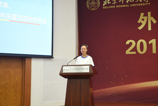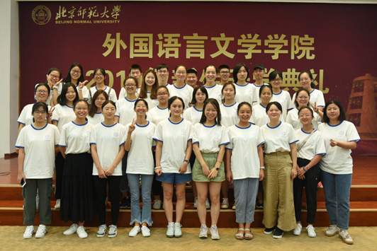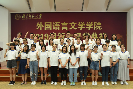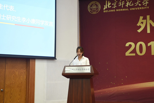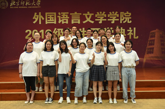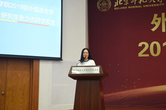 典礼在雄壮的国歌声中拉开帷幕。院长苗兴伟代表全院师生欢迎新同学的到来,衷心地祝贺2019级新生开启人生新征程。苗院长在讲话中为同学们介绍学校、学院的发展情况、办学理念、办学层次以及组织结构和人才培养目标,并对同学们提出三点希望:第一,学习是第一要务,积极探索新知;第二,积极走出国门,感悟世界文化多样性;第三,大学生活绝不仅仅是知识的学习,全面的发展和个性的养成同样重要。他希望同学们从现在做起,养成良好的学习习惯和生活习惯,塑造健全人格,提高自身素质。英文系胡笑然老师作为学院教师代表发言,她讲到,在大学学习方法需要转变,学到的是见识和思维方式,而不是在考试前死记硬背。希望同学们要对知识抱有尊敬,对生活和世界常怀有一颗孩童之心,把追求知识、独立思考变成一种习惯,拒绝浮躁与不良风气,度过快乐、纯真而充实的大学时光。随后,老生代表邵浩博、李小康,新生代表夏艺菲、张少杰分别发言。典礼最后,学院党委书记刘娟老师做了总结讲话,刘老师在讲话中与同学们探讨了“我”与“他人”的关系,她希望同学们尊重自己、善待他人,做好自己、影响他人,有良好的习惯、强健的体魄以及纯净的心灵,正确处理自己与他人、社会以及环境之间的关系。青春不是可以随意挥霍的,要珍惜每一分每一秒,坚守独立人格,牢记“三人行必有我师”,多向身边人学习,汲取优点,改正缺点,不断自我完善。典礼最后,全体师生共同齐唱校歌。