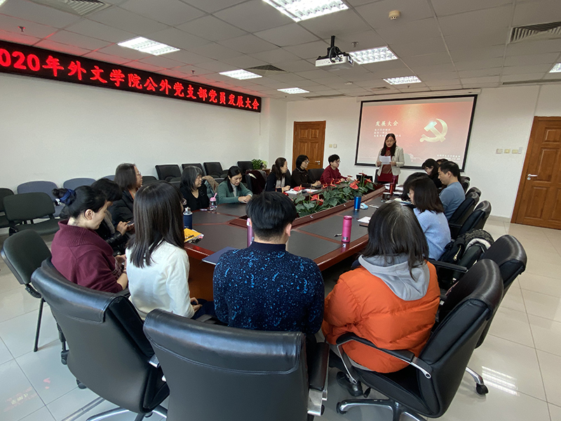 2020年12月25日上午9点,公外教工党支部在1020会议室召开张佳一同志党员发展大会。校党委组织员李多老师应邀莅临,学院党委书记刘娟老师,学工办双肩挑辅导员马亮老师参会,支部书记李航老师主持会议。