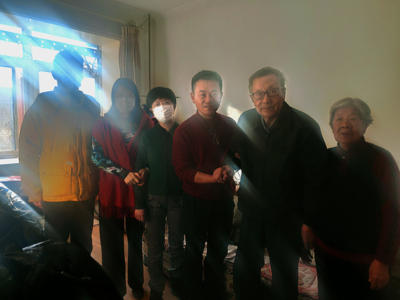 今年91岁的周景东老师在见到我们之后反反复复地说:看到你们来,我心里特别高兴。我也特别感谢我老伴,她给我做饭,给我取药。周景东老师常年抱病在家,不能下楼,听力也不好。林洪老师一直是贴着周老师耳朵与他大声交谈。尽管听力比较弱,但周老师声音依然洪亮。当我们要离开时,周老师执意起身与我们合影,并亲自把我们送到门口。