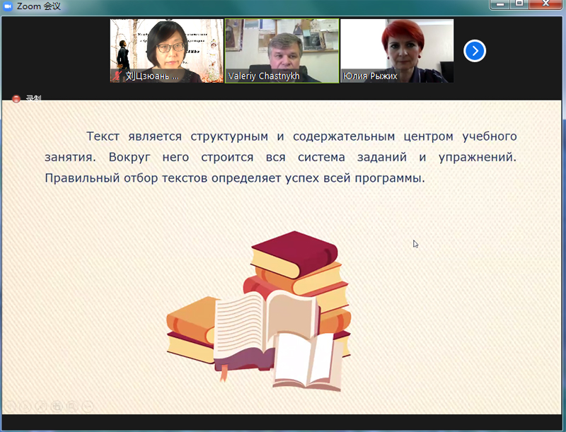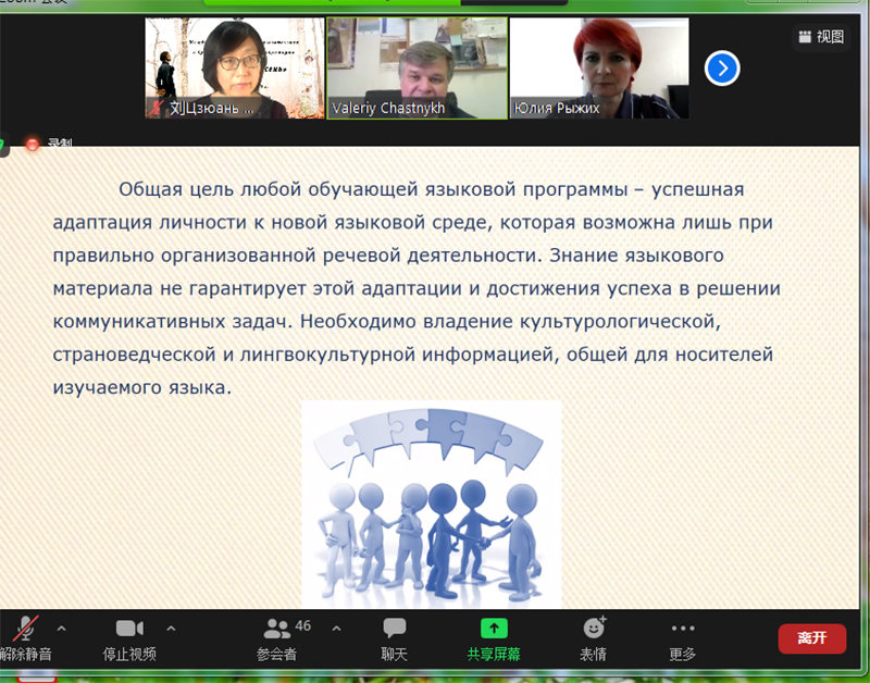 莫斯科国立大学俄语与文化学院副院长瓦列里·恰斯特内赫和该学院俄语教学专家尤利娅·雷日赫分别作了题为《在中国课堂运用改编的艺术-传记文本激发学生俄语口语能力》和《对外俄语课堂中的普希金》的发言。两位专家分别以描写普希金的人物传记和普希金的童话作品《渔夫和金鱼的故事》为例,指导中学俄语教师如何在课堂中运用文学文本。