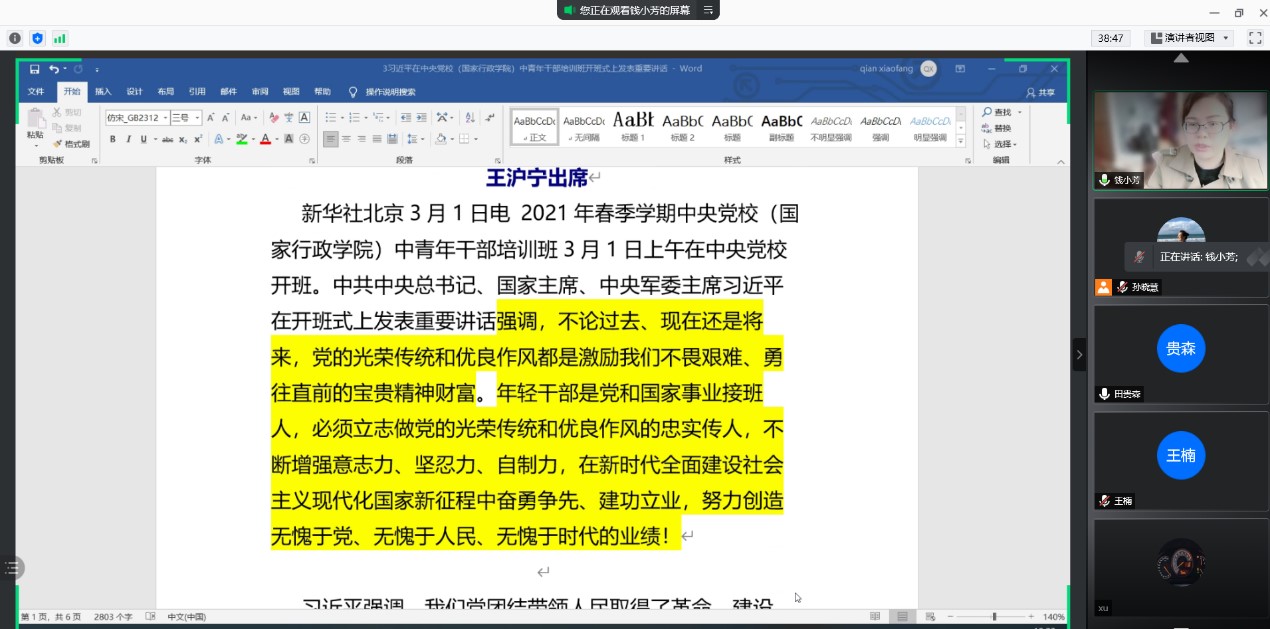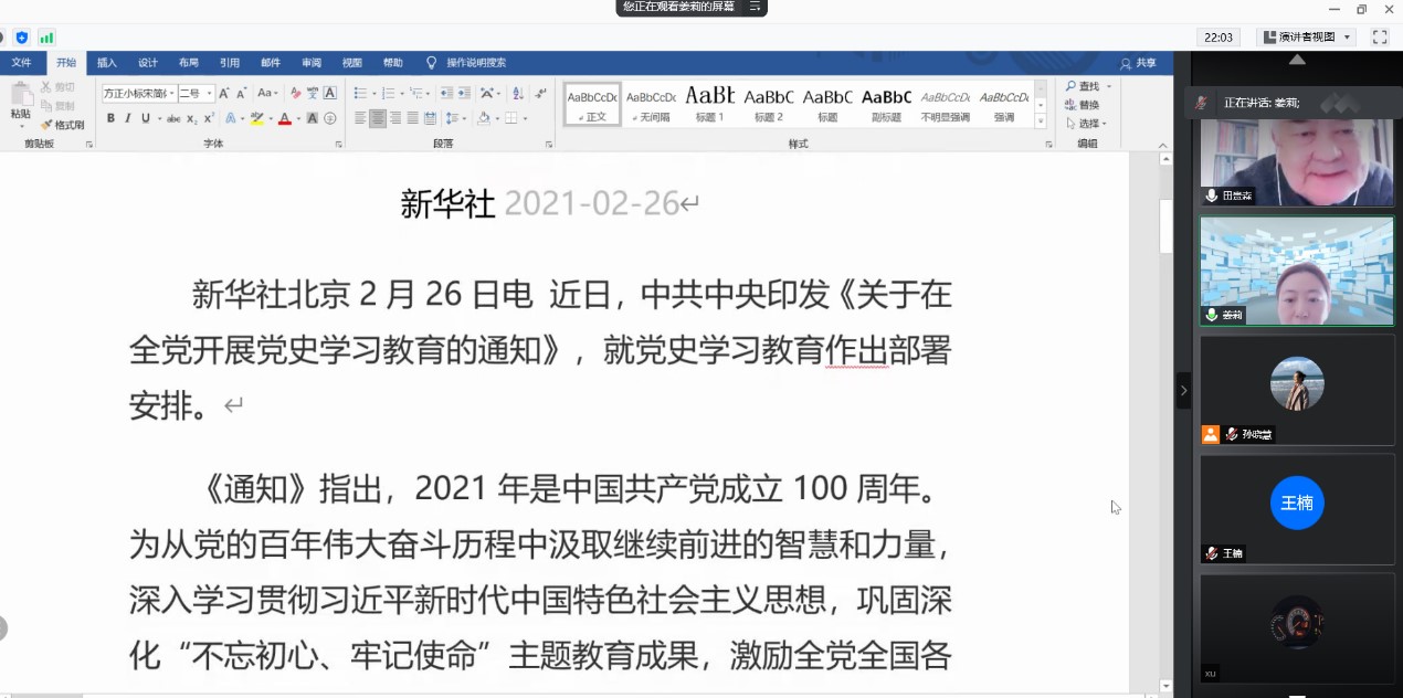 2021年3月16日上午10点,外文学院英文系党支部通过腾讯会议召开全体党员大会,会议主题为“学党史、悟思想、办实事、开新局,以优异成绩迎接建党百年”。会议由英文系党支部书记孙晓慧老师主持,英文系党支部共19名党员和1名入党积极分子参加了此次会议。会议开始,孙晓慧老师首先介绍了本次会议的主要内容和安排,接下来,由姜莉老师和钱小芳老师分别带领大家学习了《习近平总书记在党史学习教育动员大会上的讲话》、《中共中央印发《通知》 在全党开展党史学习教育》、《习近平在中央党校(国家行政学院)中青年干部培训班开班式上发表重要讲话》和《习近平在全国脱贫攻坚总结表彰大会上的讲话》,随后王楠老师带领大家学习了《中共中央国务院印发《深化新时代教育评价改革总体方案》》和《《深化新时代教育评价改革总体方案》负面清单》,苗兴伟院长对上述两个文件进行了深入解读,并号召大家认真学习,深刻领会文件精神。最后,孙晓慧老师带领大家学习了《习近平在2021年春节团拜会上的讲话》和《教育部关于印发《普通高等学校本科教育教学审核评估实施方案(2021—2025年)》的通知》,并对本学期英文系支部工作进行了整体安排。