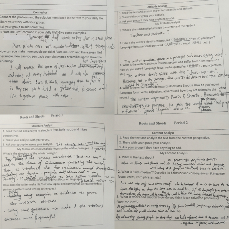 从学生的学习和产出的角度看,学生们积极参与,并且敢于发表自己观点。通过参与个人或小组活动,都能从课堂中有所收获、有所产出。在两位老师的课堂上,几乎每个环节都能看到学生的产出,例如导入环节中学生写下的三句话,学生对just-me-ism的定义,思维导图及第二堂课的语篇分析等等。