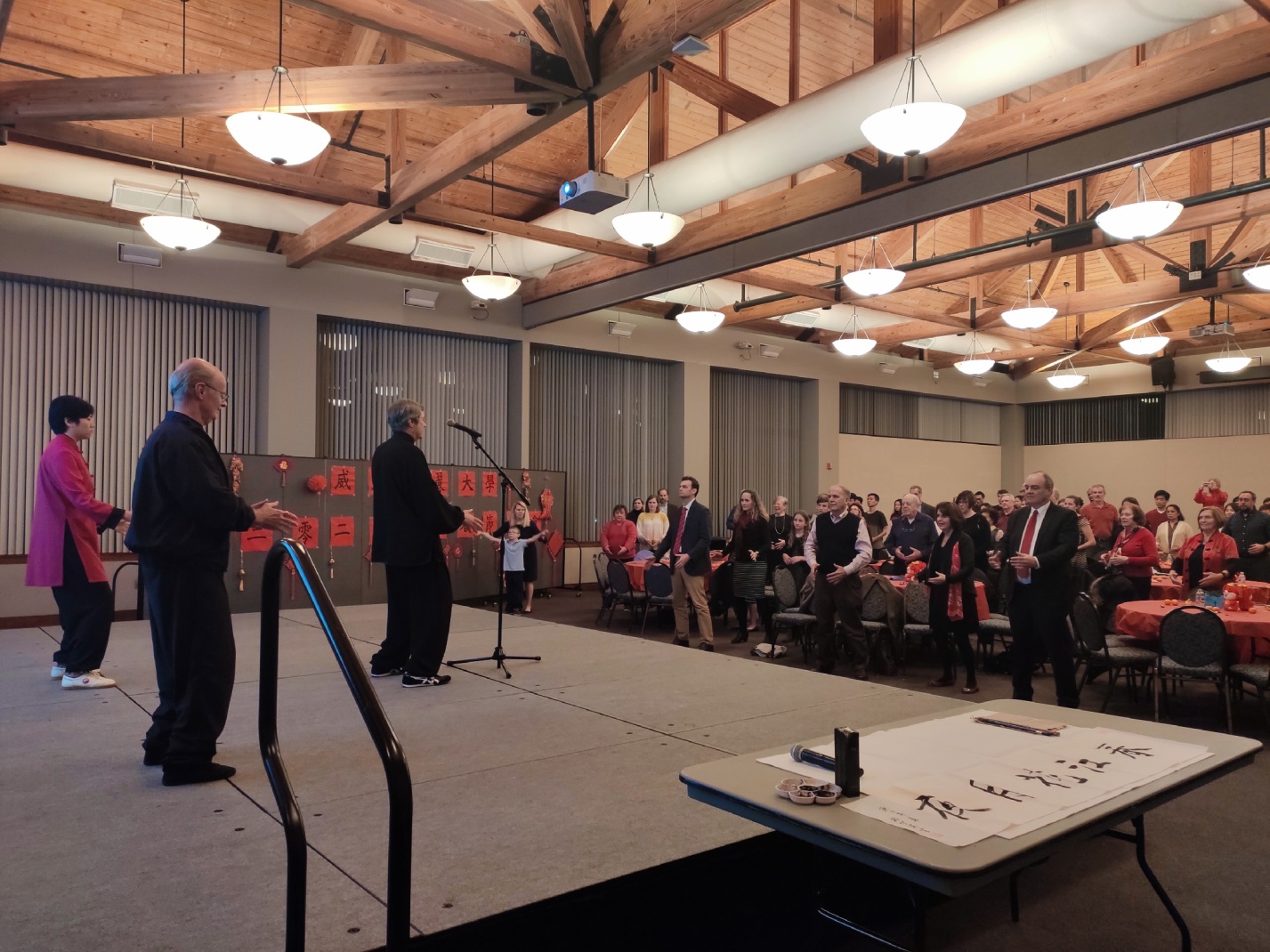 此次联欢会还设置了一个互动环节,威廉斯堡当地气功爱好者Stan Rockwell,武术爱好者Jim Goode以及孔院志愿者冯梦楠一同为大家带来了一场现场气功演练。包含了三组训练,旨在通过冥想及站桩的方式让大家体会气功文化的魅力。全场齐参与,闭目调息,感受与寻找自身的力与气。气功并不是什么高深莫测的玄学,而是一门实用且易行的身体训练。训练结束,每个人的脸上都增添了一些轻松祥和。