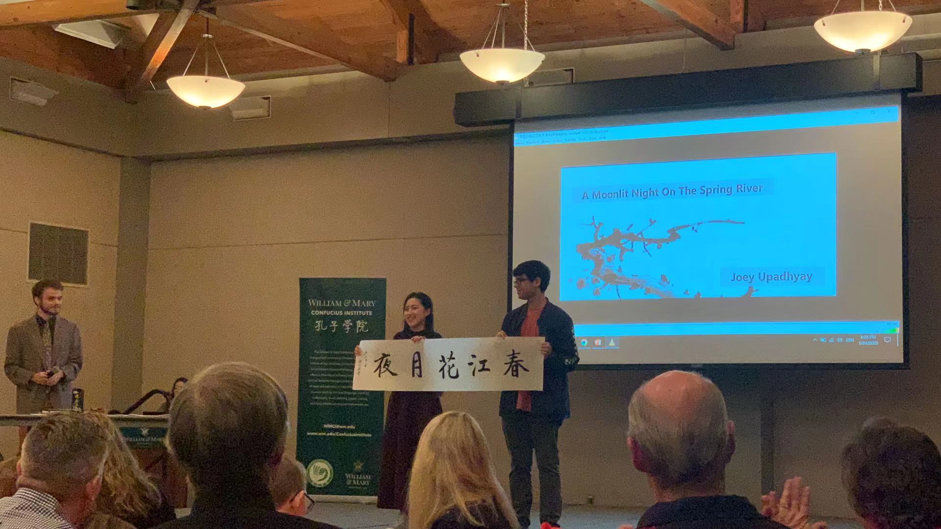 第二个节目由威玛孔院志愿者林宁英和她的中文社区课学生Joey合作完成。Joey热爱中文,在孔院半年来的学习进步巨大,这次春晚便为大家带来了一首经典诗歌朗诵--《春江花月夜》,意境空明,想象奇特,语言自然隽永,韵律宛转悠扬。而志愿者林宁英在现场进行了中国书法展示,挥毫写下了一副“春江花月夜”,演出结束,响起了热烈的掌声。
