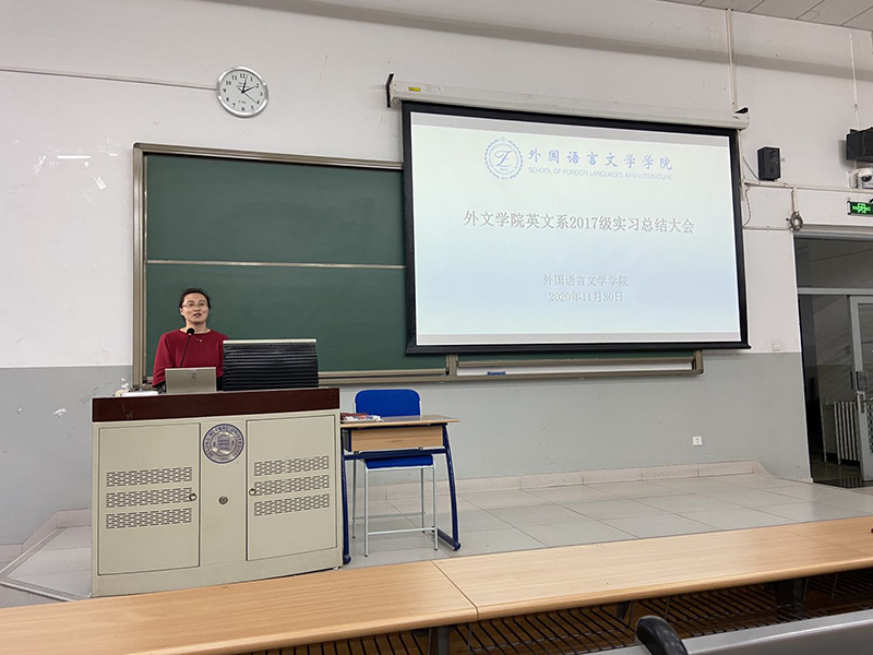 2020年11月30日下午2点,外文学院英文系在化学楼一教室召开了2017级本科生实习总结大会。外文学院副院长陈则航老师、英文系主任王楠老师和英文系副主任孙晓慧老师以及2017级英语专业和英语师范专业的本科生参加了此次总结大会。会议由英文系副主任孙晓慧老师主持。本次会议邀请了参加教育实习的两名学生代表和专业实习的一名学生代表分享了自己的实习经验和感受。