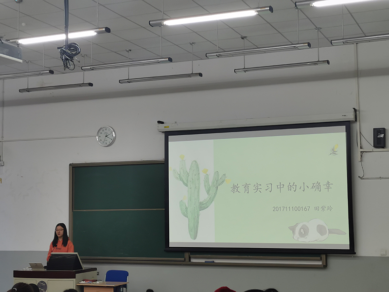 第二位分享的是在北师大附属实验中学进行教育实习的田紫玲同学,她的主题是“教育实习的小确幸”。她从教育实习的基本情况和班主任工作与英语教学工作两方面进行了分享。在实习的五周中,田紫玲同学认真备课、说课以及试讲,不断和老师进行交流,逐渐熟悉班主任工作,也逐渐和同学们熟悉起来。在班主任工作方面,她主持了班会,主题为“何以中国 何以实验”,取得了非常好的效果。在教学方面,她学到了教师要根据实际情况对教材进行二次开发,在教学中还可以进行一点学科交叉,她领悟到了“教学是不可能完美的”,“要始终对教学充满信心与热情。”之所以称教育实习为小确幸,是因为这段经历给她留下了非常深刻与温暖的记忆,同时也激励着她向成为一名优秀教师的方向继续努力,不断提升自我。
