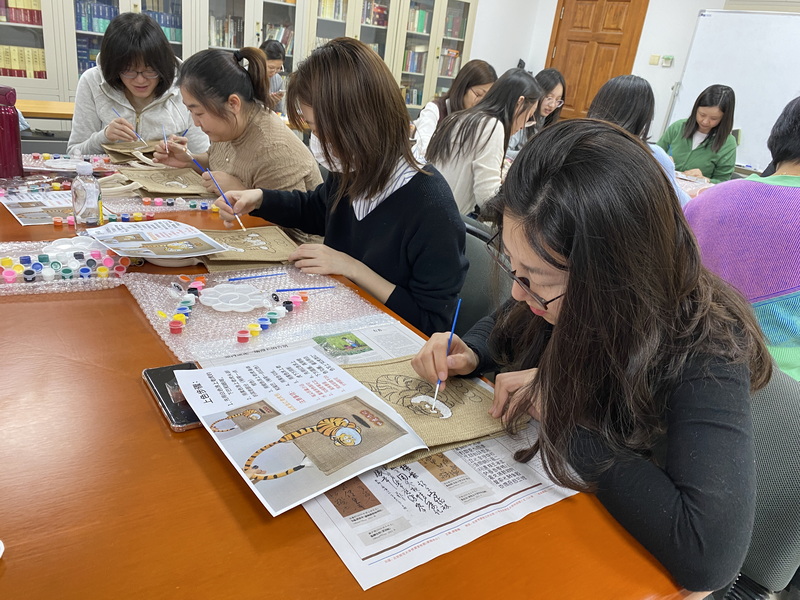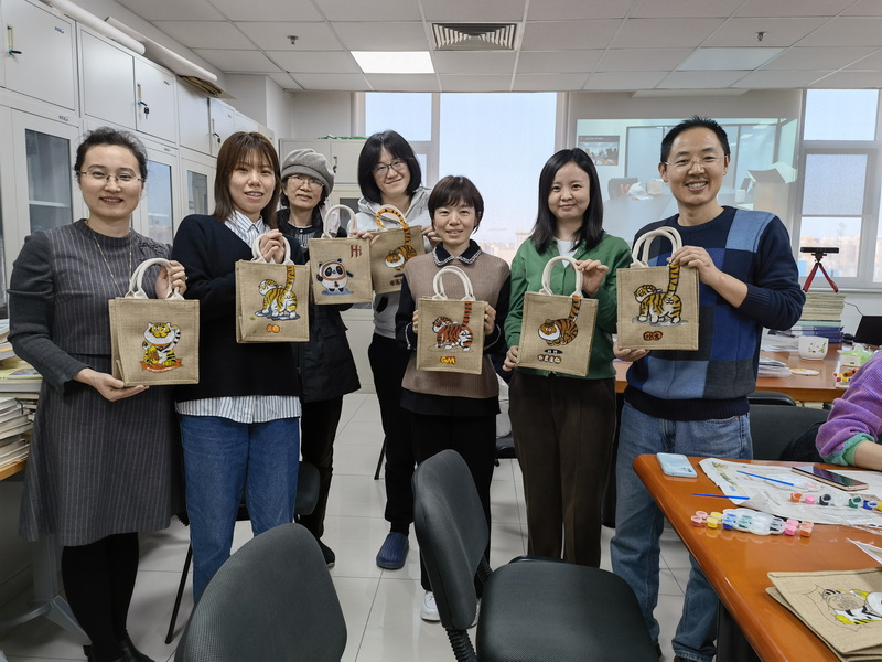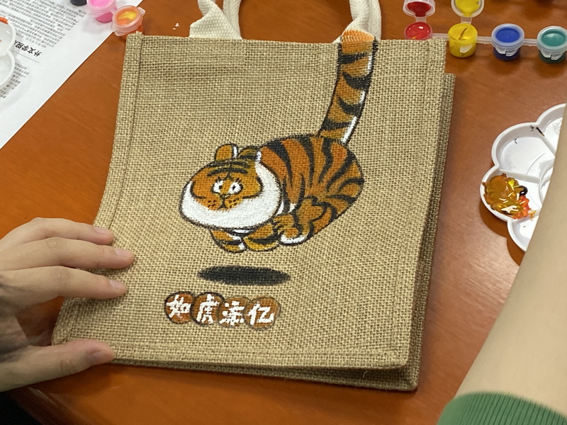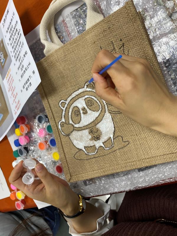 活动伊始,老师们领取了手绘包的相关材料,选择了自己喜欢的图案,很快就进入了手动操作状态。欢声笑语中,老师们在手工包上描绘出一个个栩栩如生、形态各异的卡通老虎形象,十分贴合新学期喜气洋洋、一派祥和的气氛。之前在北京冬奥会上赢得大家深深喜爱的吉祥物冰墩墩也在许多老师的手工包上跃然呈现。愉悦轻松的氛围使老师们喜笑颜开,鲜活生动的卡通形象为忙碌的生活增添了一抹靓丽的色彩。
