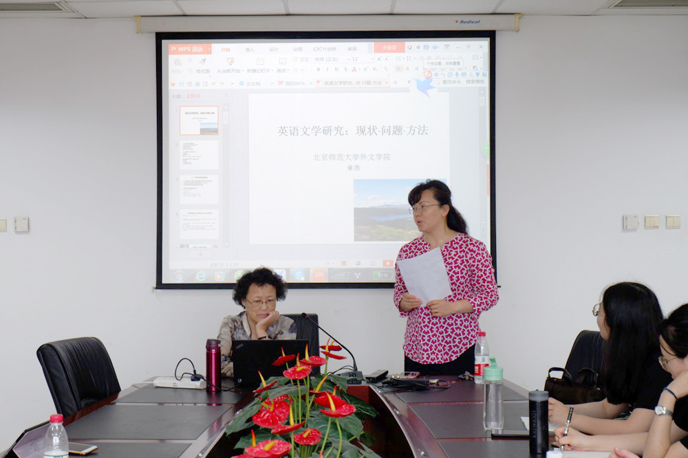 下午13:30,后主楼1020会议室,第一场学术讲座开始。英文系主任王楠教授为同学们简单介绍了讲座内容,随后,章燕教授就“英语文学研究:现状·问题·方法”为同学们带来了精彩的文学讲座,勾勒了当前世界范围内英语文学研究的大致轮廓,并以对华兹华斯的《水仙》的研究为例,简要介绍了英语诗歌研究的角度和方法。