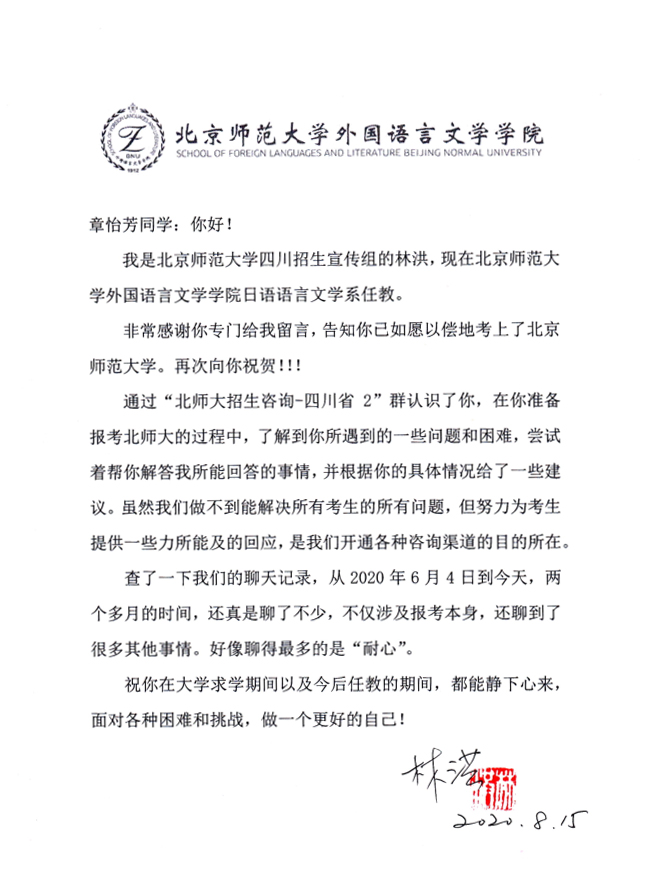 一封来自报考北师大考生的感谢信2020-09-17一封来自报考北师大考生的感谢信。 -