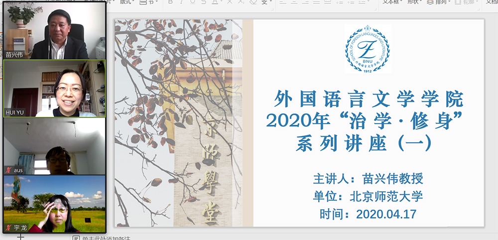 2020年度“治学·修身”系列讲座(一)圆满结束2020-04-254月17日下午,外文学院院长苗兴伟教授参加研会“治学·修身”系列讲座,在Zoom会议平台上为大家带来了一场题为“拟人化语法的生态话语分析”的“云”讲座。 -
