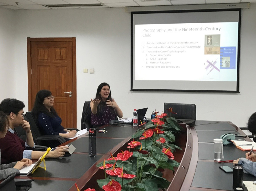 外籍教师Dr. Jessica Medhurst来英文系做讲座2019-04-103月20日下午,英文系邀请英国雷丁大学博士外籍教师Dr. Jessica Medhurst 为全院师生作了题为“Lewis Carroll Beyond Wonderland: Photography and the Nineteenth Century Child”的讲座。 -