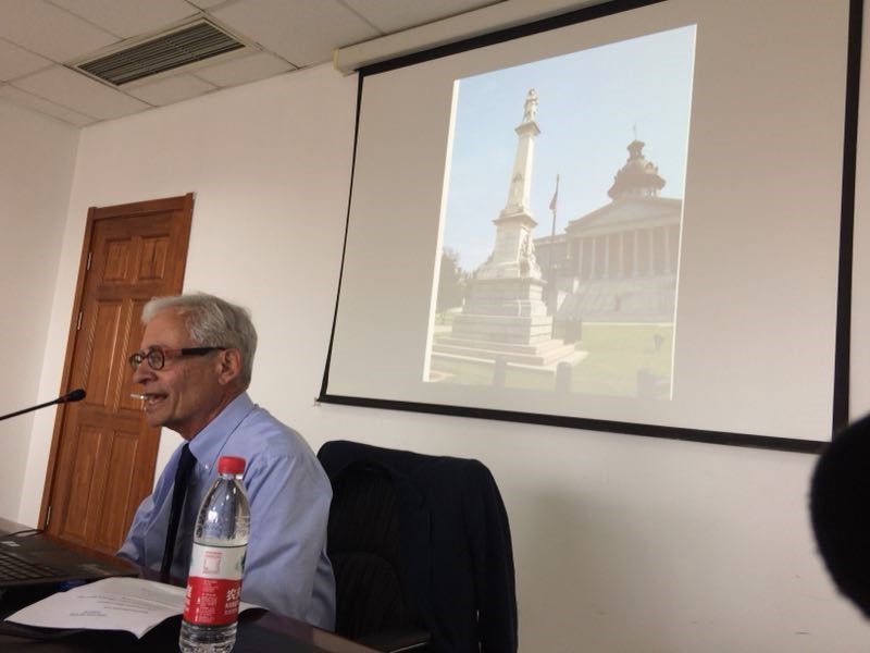 外国文学研究所系列讲座(56)圆满结束2018-05-28为提高学生文学素养,拓宽学生眼界,5月22日下午1:20,外国文学研究所邀请由美国大使馆推荐的David R.Goldfield教授在后主楼1020会议室举办名为“飘(Gone with the Wind)”的文化讲座,来自外文学院各专业的20余名学生参加了讲座。 -